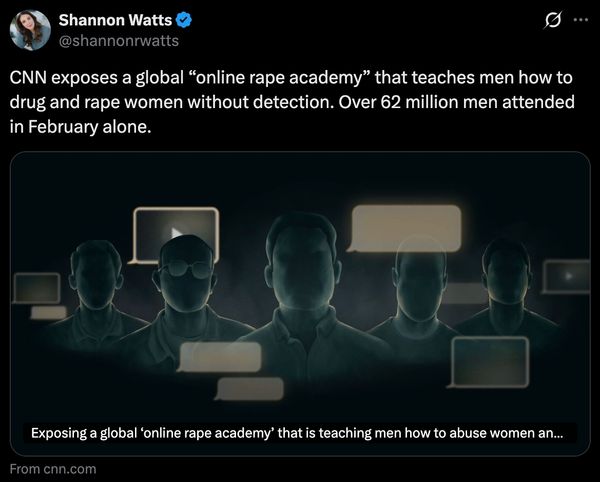 Misalnya, pada 15 April, seorang pengguna X memposting (arsip), “CNN mengungkap sebuah ‘akademi pemerkosaan online’ global yang mengajarkan pria bagaimana meracuni dan memperkosa wanita tanpa terdeteksi. Hanya pada Februari lebih dari 62 juta pria menghadiri.” Postingan tersebut mendapat sekitar 2 juta tayangan. Pengguna lain membagikan klaim yang sama di Bluesky, Facebook, Threads dan X.