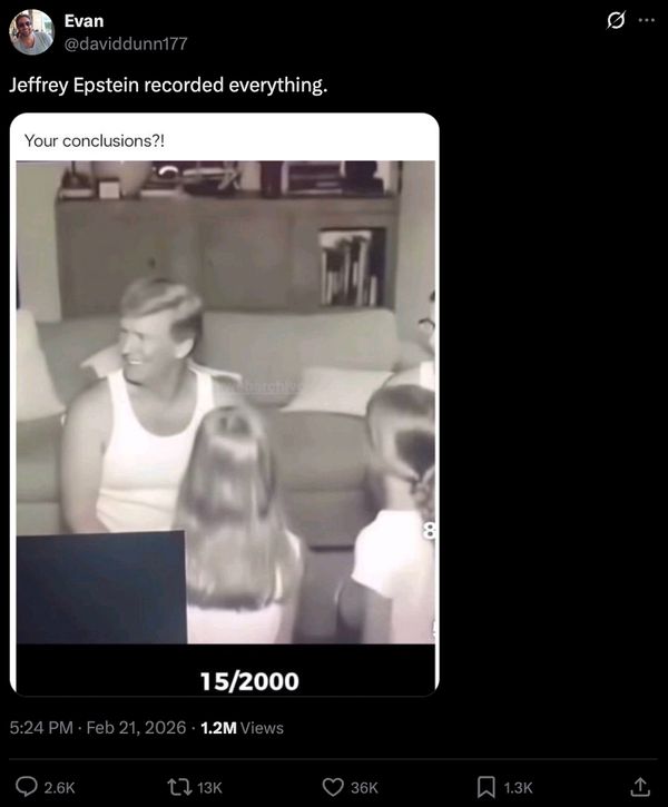 Postingan X milik seorang pengguna pada Februari 2026 (diarsipkan) dengan gambar tersebut menerima lebih dari 1 juta tayangan. Teks keterangan pengguna tersebut berbunyi, “Jeffrey Epstein merekam semuanya.”